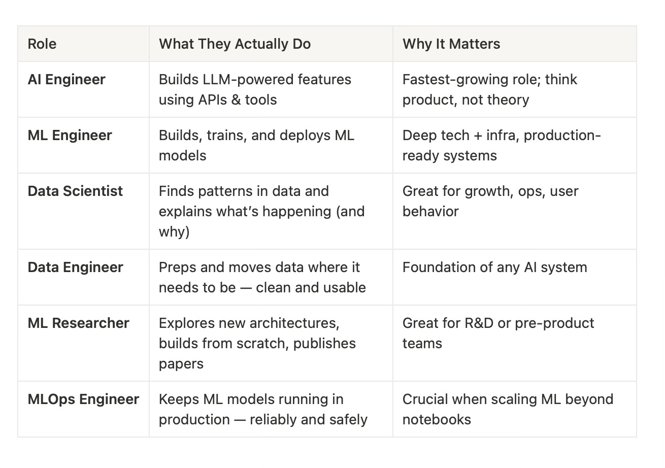 AI Engineers don’t train models — they use existing ones (like GPT) and turn them into real product features. Think product-minded builders.